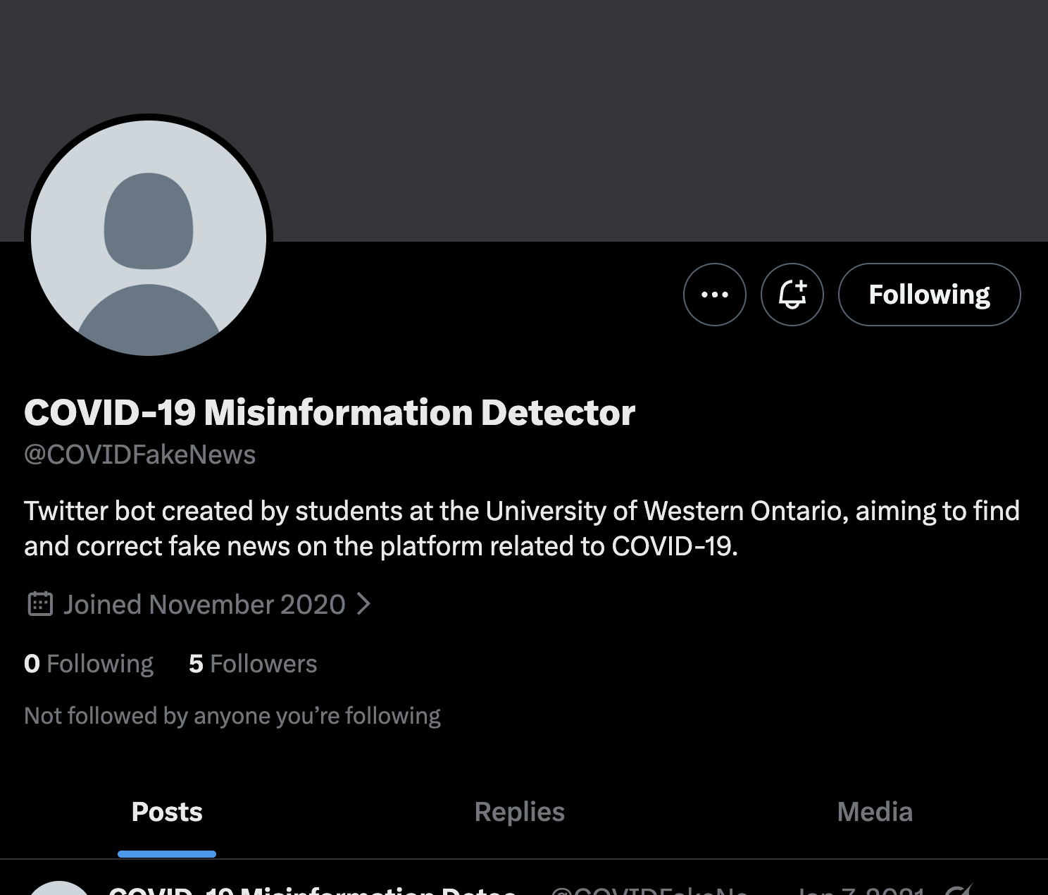 Twitter bot created in C on a Raspberry Pi that flags misinformation provides resources to help people avoid misinformation